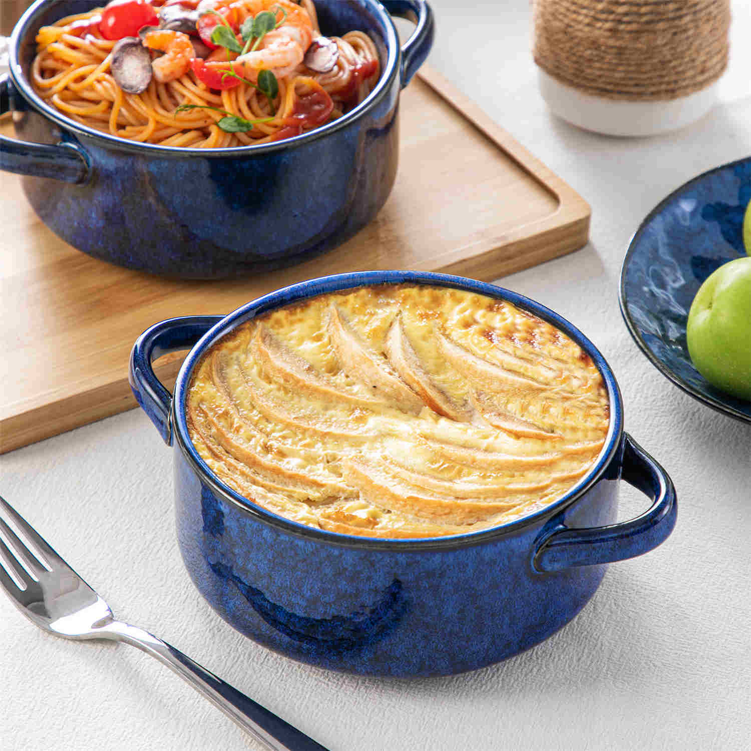 Designed for serving French onion soup, these stoneware bowls feature a captivating blue reactive glaze that adds farmhouse charm to your dining experience. Each bowl has two large, comfort-grip handles for easy transfer from oven to table. With a generous 30oz capacity, they are ideal for soups, stews, casseroles, and more. Scratch-resistant and safe for broiling, dishwasher, microwave, and freezer use, these bowls offer both durability and practicality for your kitchen.
